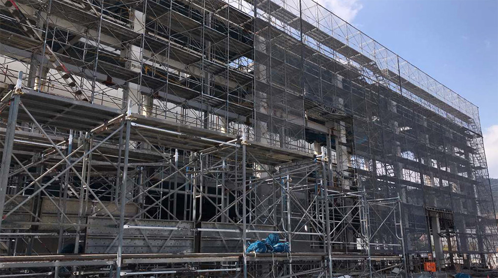 くさび式足場のメリットは施工性の高さにあります。ハンマー1本さえあればすぐに組み立てられるので、施工時間を大幅に短縮できるのです。スケジュールがつまっている現場などでおすすめです。低、中層の建物によく使われます。